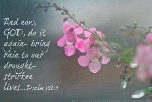 Now, we tend to think of the negative impacts of a FLASH FLOOD – but the Psalmist is asking for the positive side of it! He’s asking God to come RUSHING in, to bring a FLASH FLOOD of salvation. He is asking for the SUDDEN WORK of God. Like a flood of water to a dry, weary land – God can bring SUDDEN and Immediate change! He can SWEEP away the old stuff and bring new life, in just a moment.